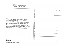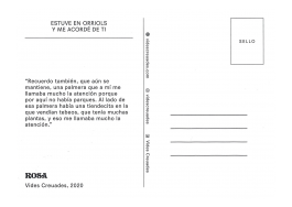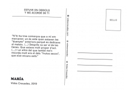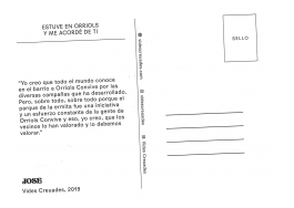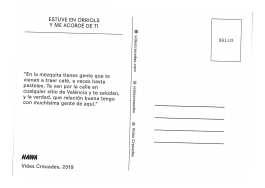 “Estuve en Orriols y me acordé de ti” es una acción planteada por Grigri Projects que pretende seguir reuniendo a más gente en alrededor de los círculos de confianza del proyecto. A través de una cadena de postales que transportan las historias de algunas personas y lugares del barrio, se forman nuevas conexiones y relatos sobre lugares del barrio, escritos de puño y letra por sus protagonistas.